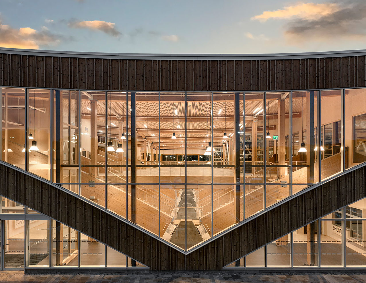 Målet att bygga i trä gav tidigt byggnaden sin arkitektoniska form såväl som sin materialitet. Under de totalt 160 meter långa limträbågarna förenas en hållbar träbyggnad med en funktionell konstruktionslösning som uppnår önskvärda rumshöjder och friyta utan pelare. En båge spänner över sporthallen, en andra över ishallen och en uppåtvänd båge över café och foajé i mitten. En fin vågform som präglar både exteriör och interiör!