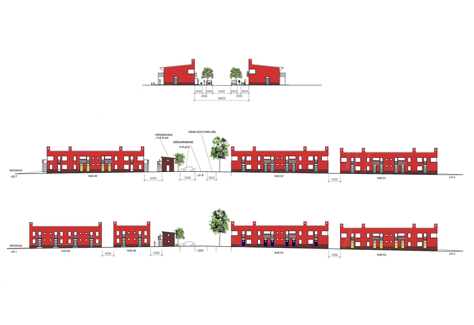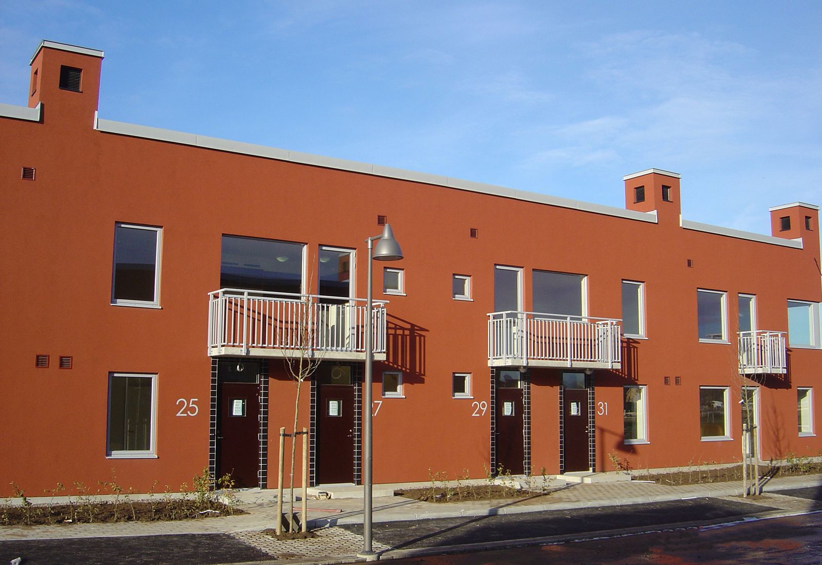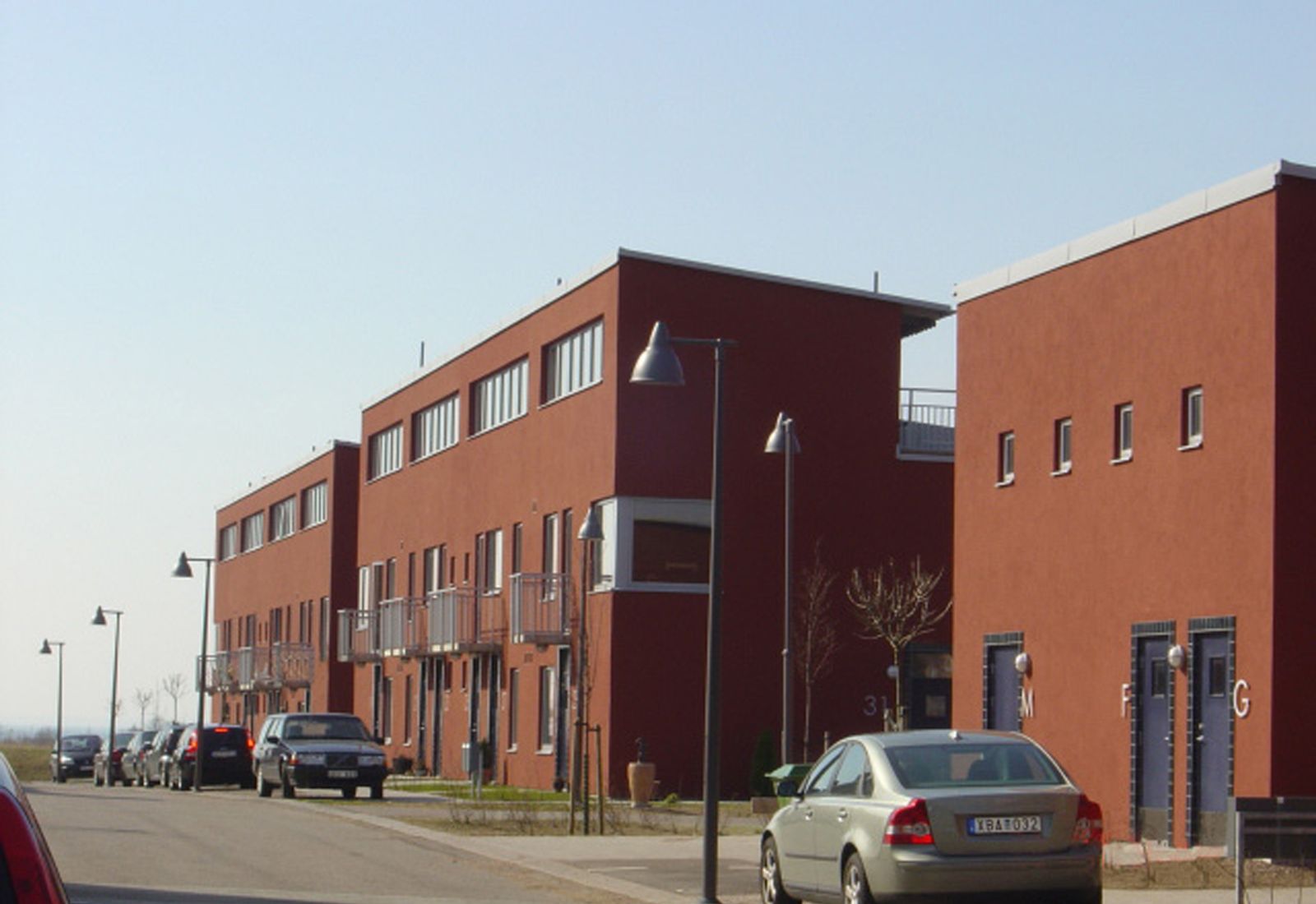 Område med flerfamiljshus och radhus. Totalt 88 lägenheter i hyresrätt.