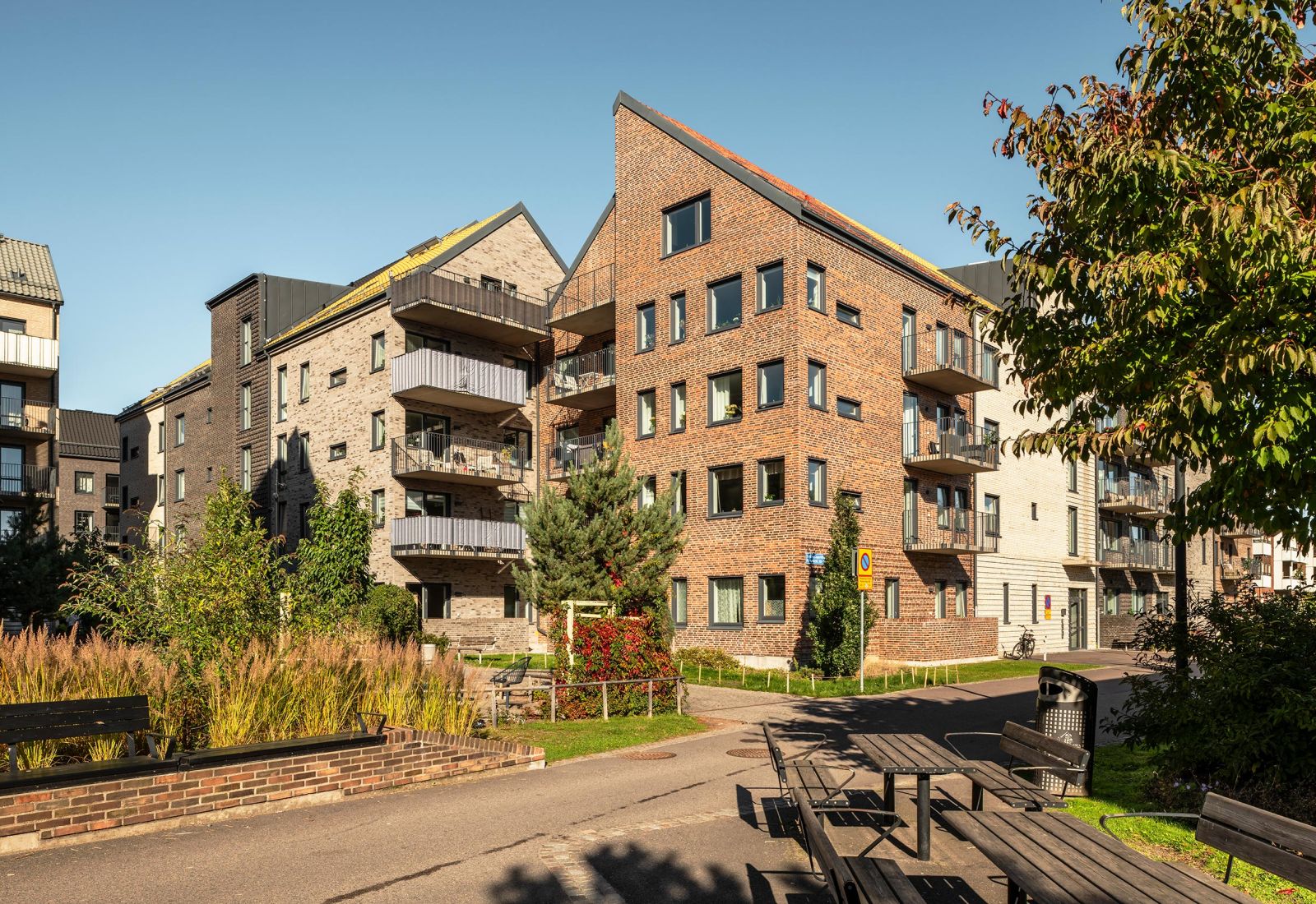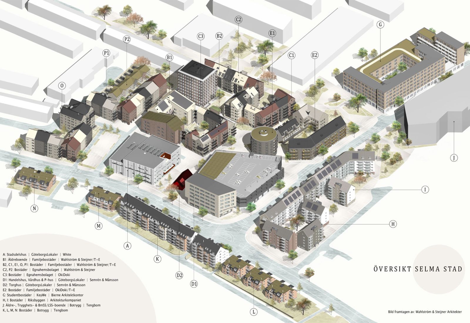 Vi har medverkat som arkitekter från programhandlingsskedet till förfrågningsunderlag/bygghandling, där vår del innefattat totalt 346 bostäder fördelade som 61 bostadsrätter, 229 hyresrätter samt 56 lägenheter som äldreboende. Dessa kvarter stod färdiga i sin helhet i augusti 2024.