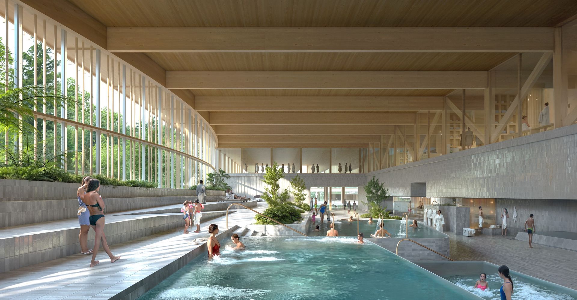 Arkitekturen är lekfull och organisk och erbjuder staden en modern tolkning av arvet från det prisbelönta Valhallabadet och landar, trots sin storlek, ödmjukt i sin omgivning på tävlingstomten. En lätt och böljande träfasad bryter upp de stora volymerna och samspelar med all den rörelse som rymmer sig där innanför och skapar en rad unika, upplevelserika rum för olika ändamål.