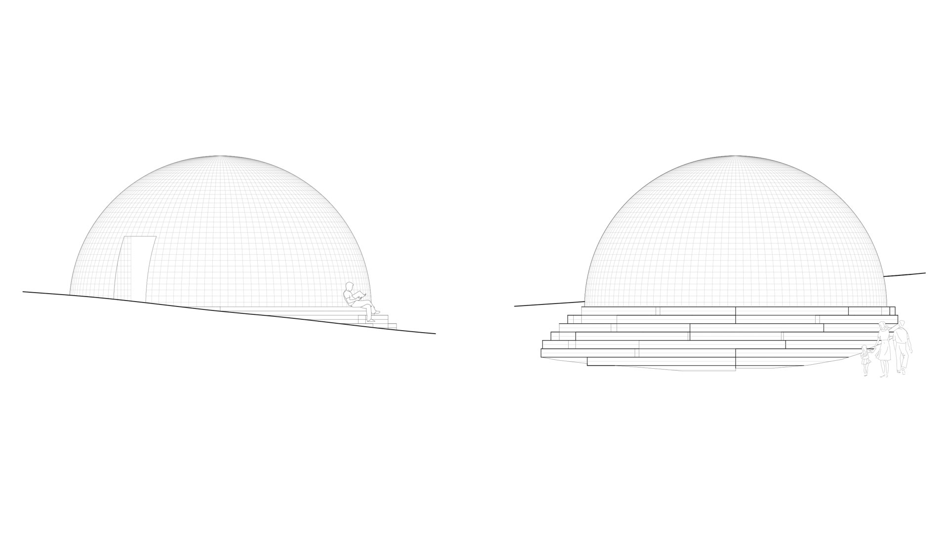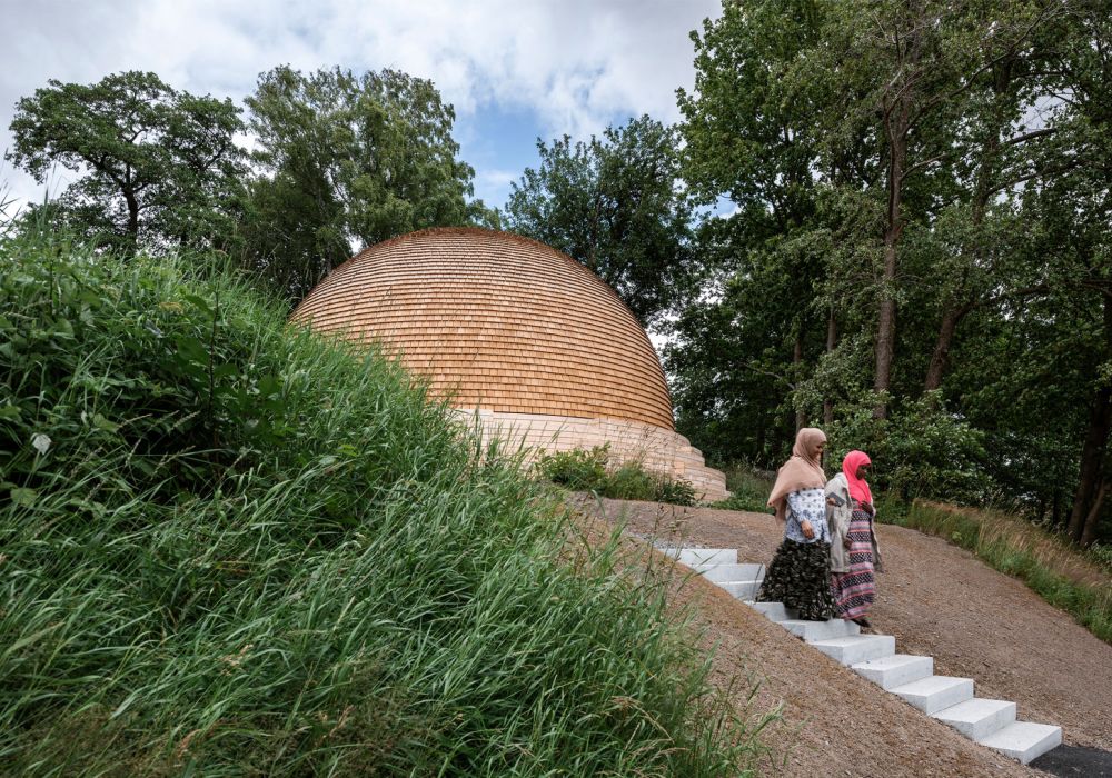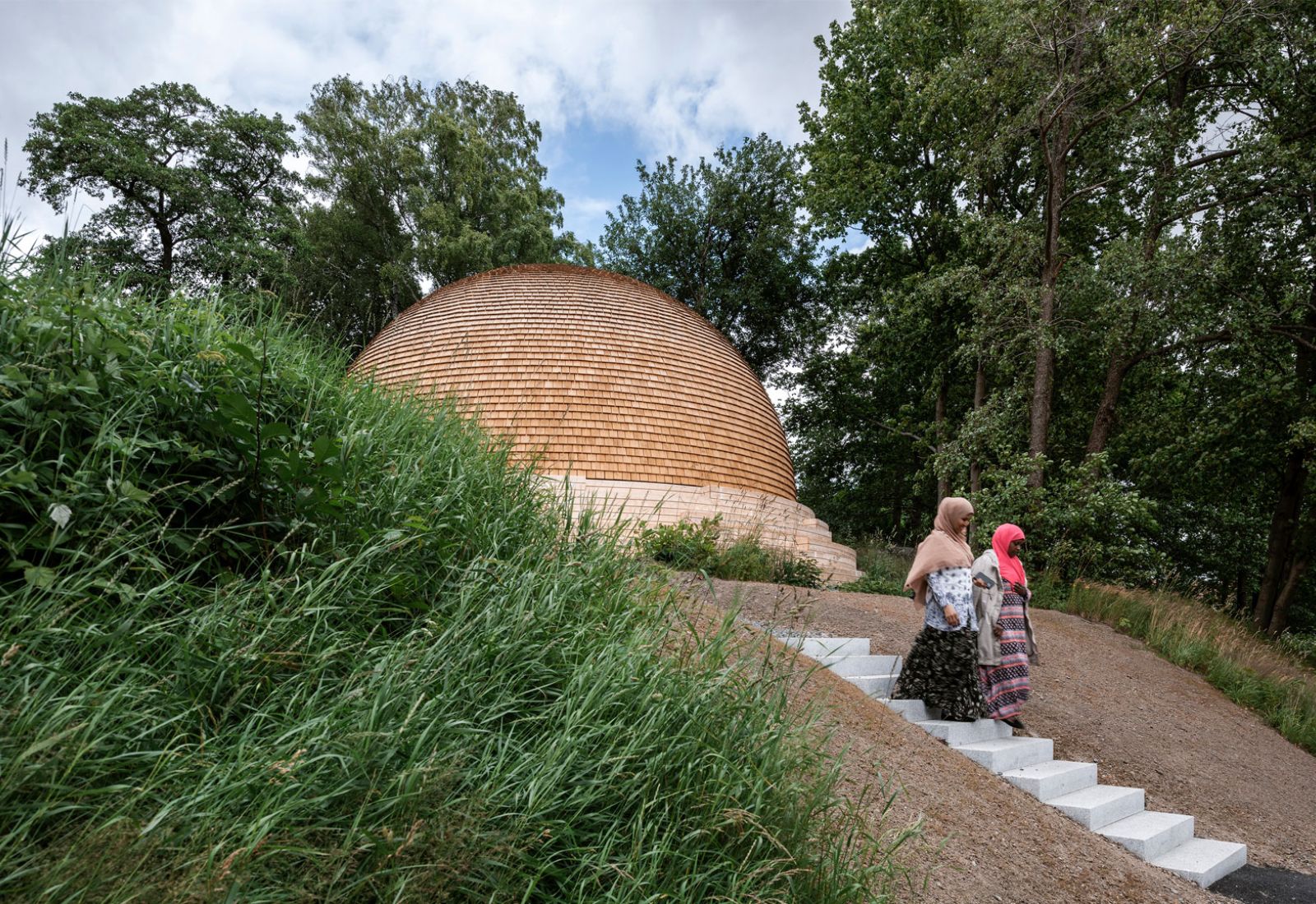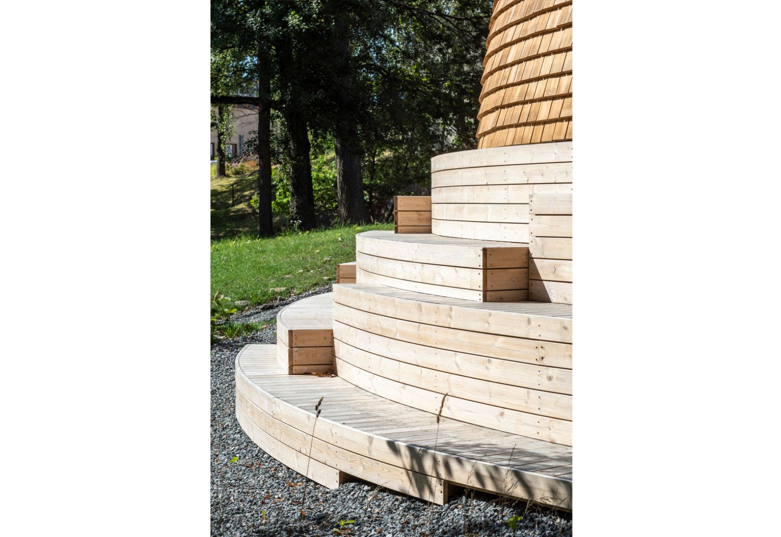 Kupolen är placerad i en sluttning, vilket har gjort det möjligt att i dess sydvästläge skapa en gradäng av kiselbehandlad furu. Här ska förbipasserande kunna slå sig ner och koppla av en stund.
