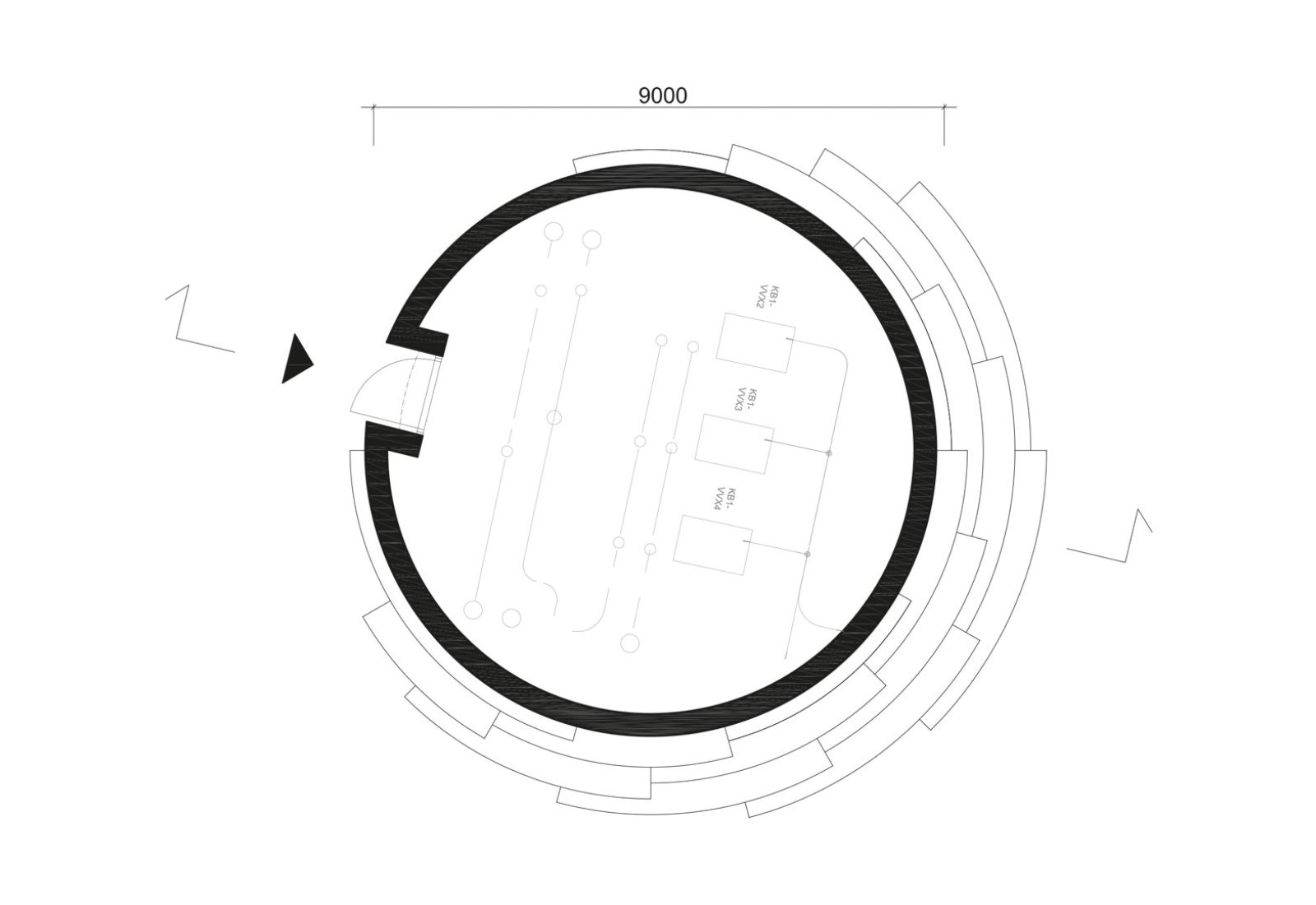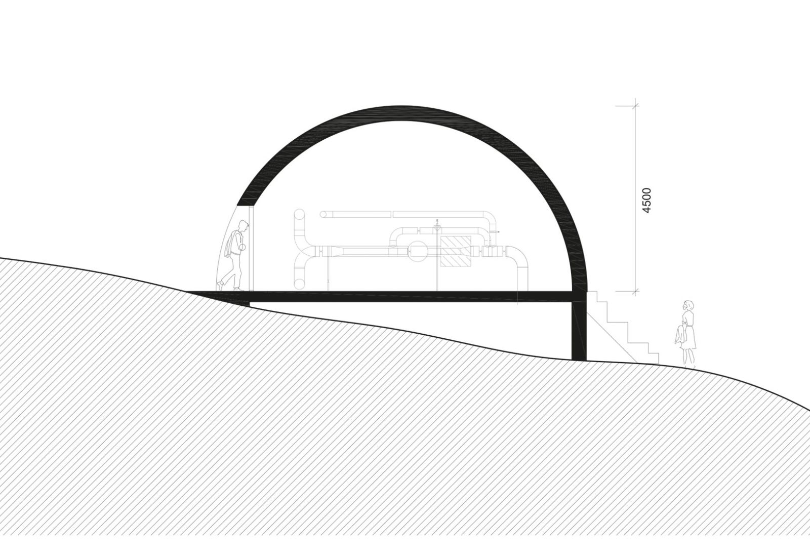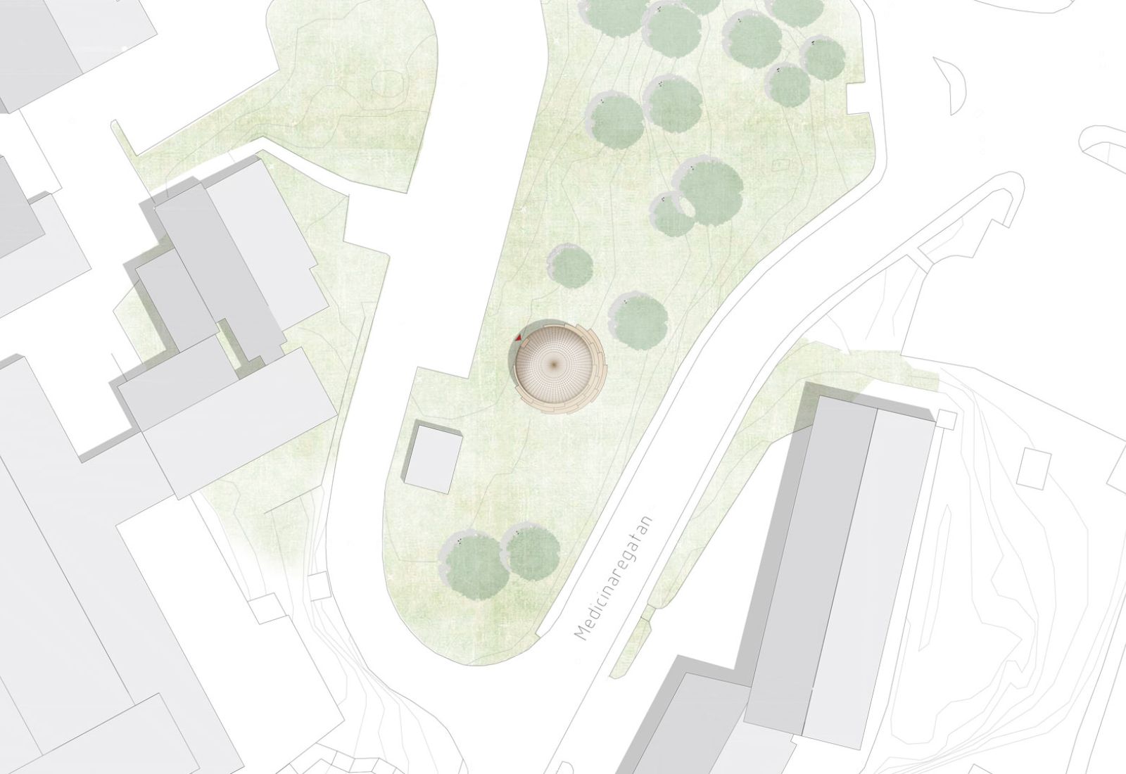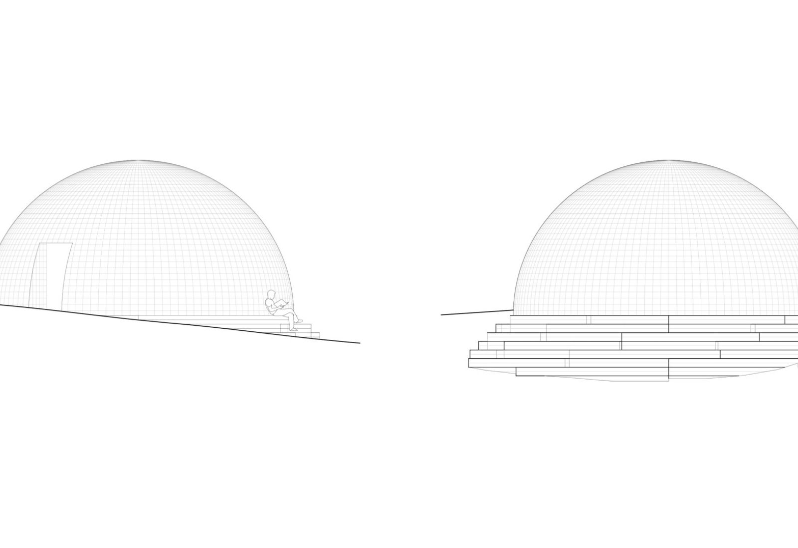 Kupolen är placerad i en sluttning, vilket har gjort det möjligt att i dess sydvästläge skapa en gradäng av kiselbehandlad furu. Här ska förbipasserande kunna slå sig ner och koppla av en stund.