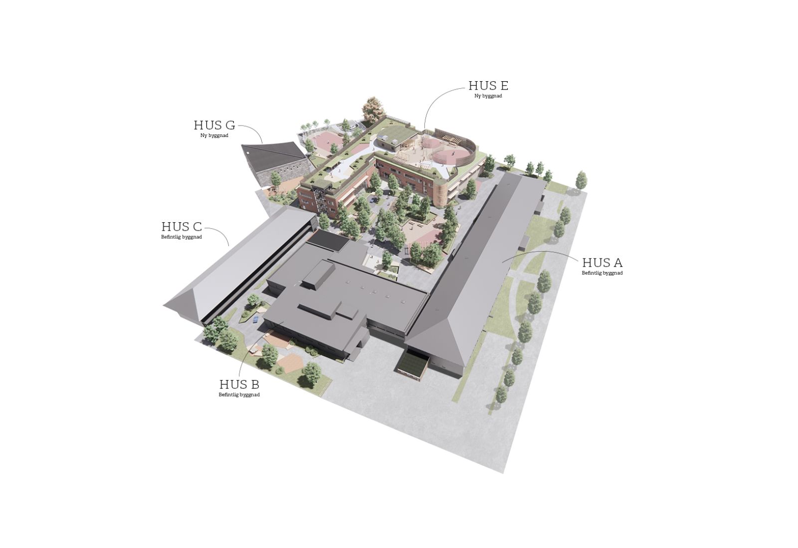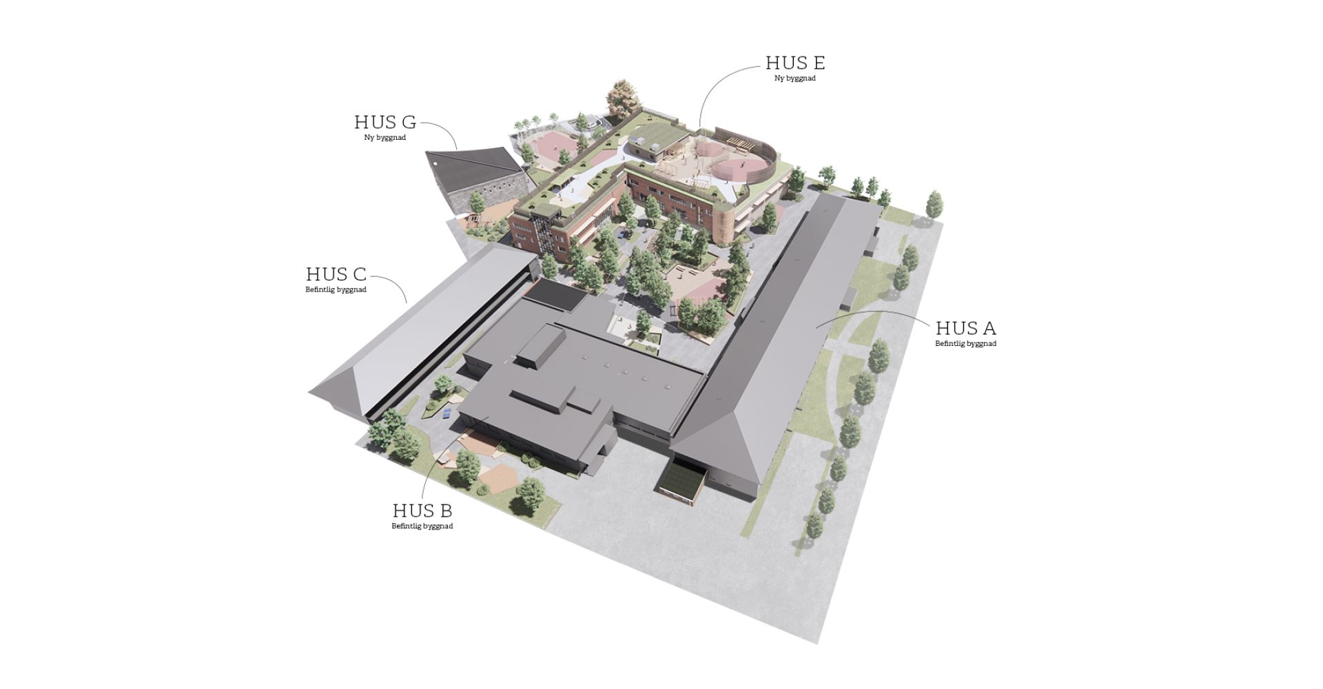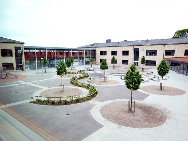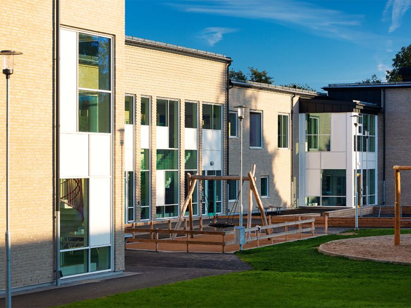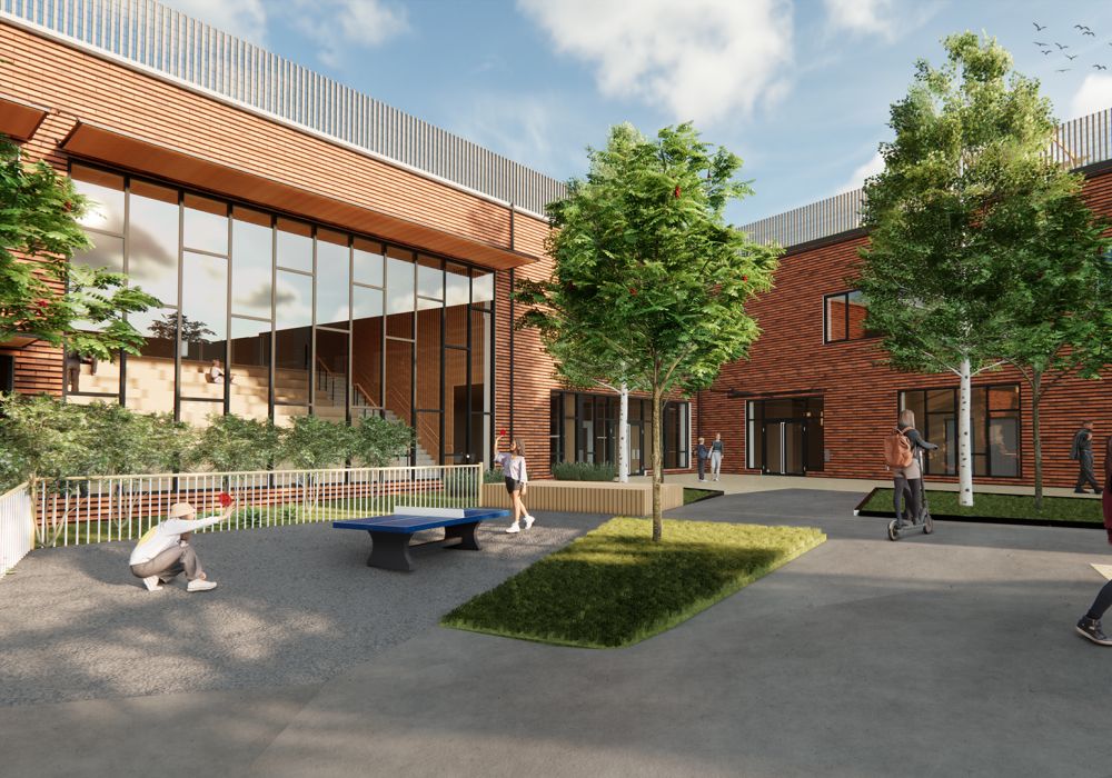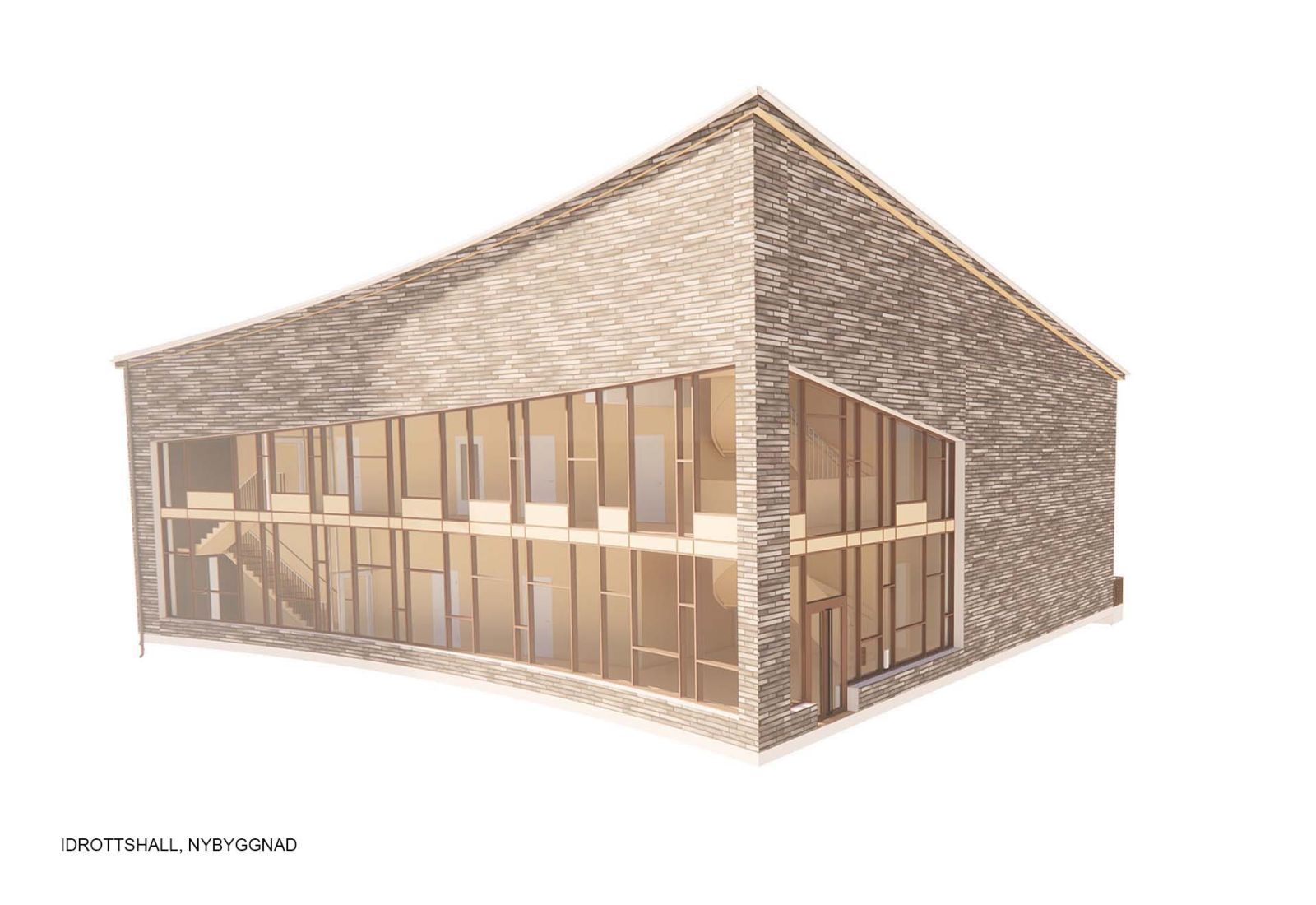 Den befintliga högstadieskolan kompletteras med en ny byggnadskropp, innehållande en ny idrottshall, undervisningslokaler samt en stor utvändig takgård för rast och rekreation utformad av 02Landskap.