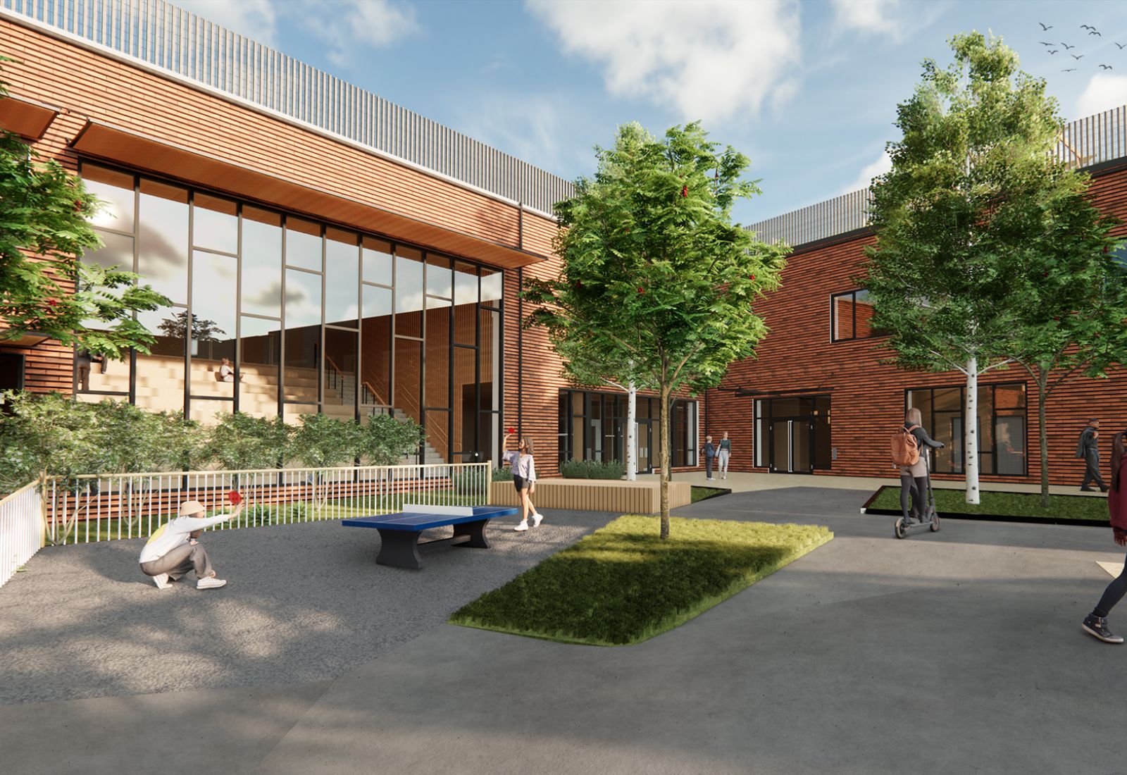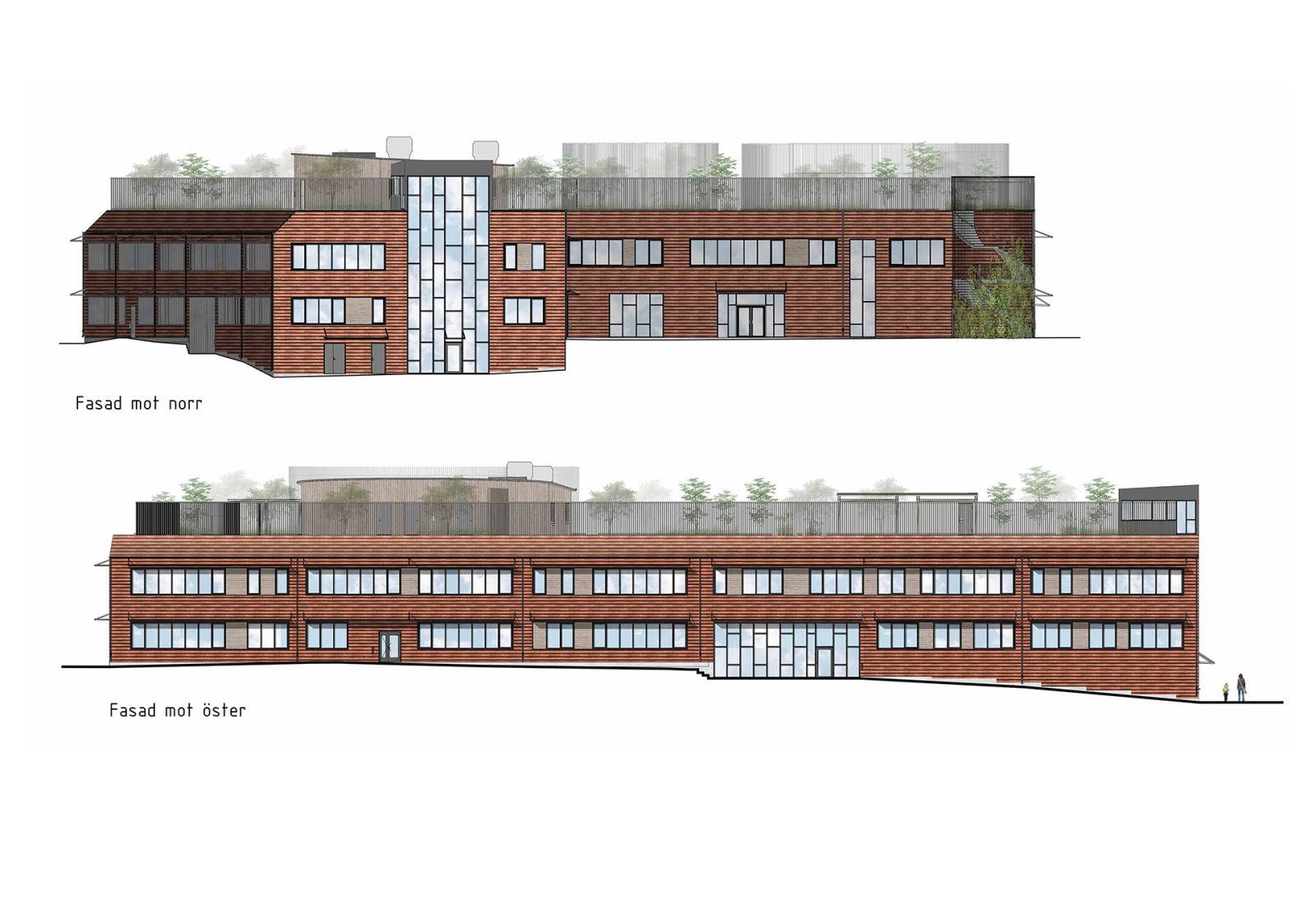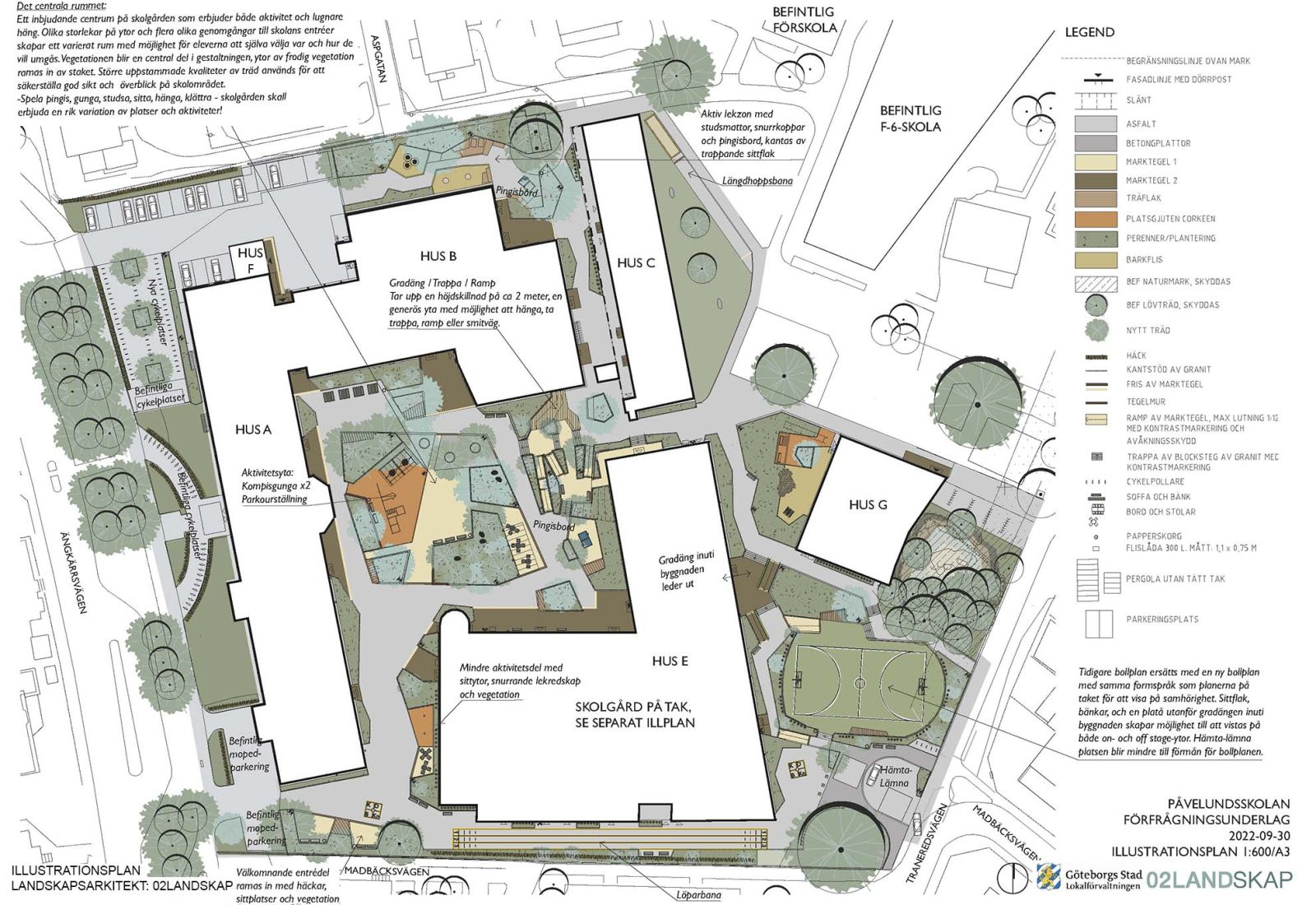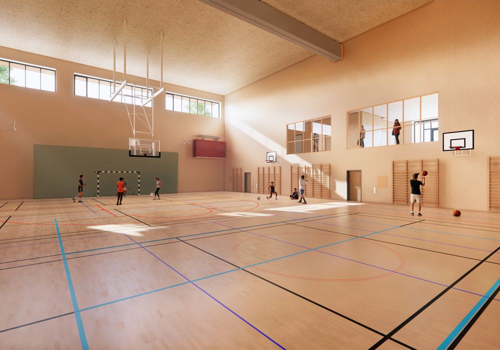 Den befintliga högstadieskolan kompletteras med en ny byggnadskropp, innehållande en ny idrottshall, undervisningslokaler samt en stor utvändig takgård för rast och rekreation utformad av 02Landskap.