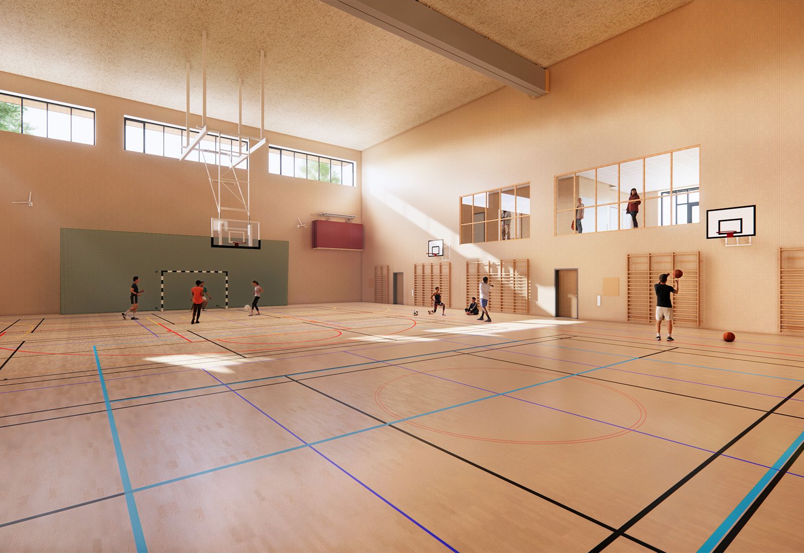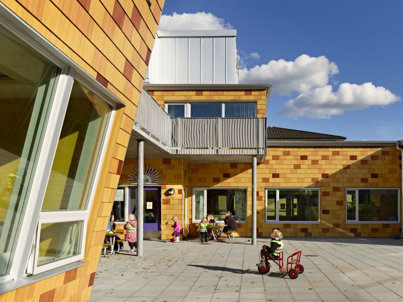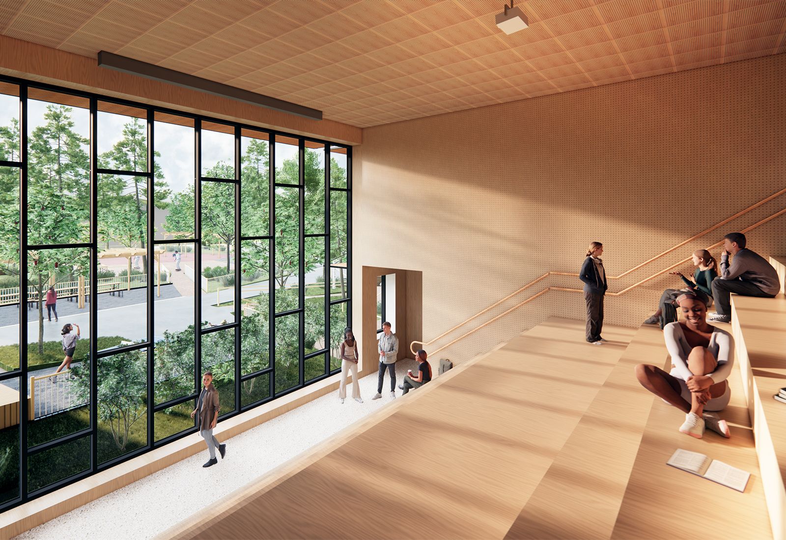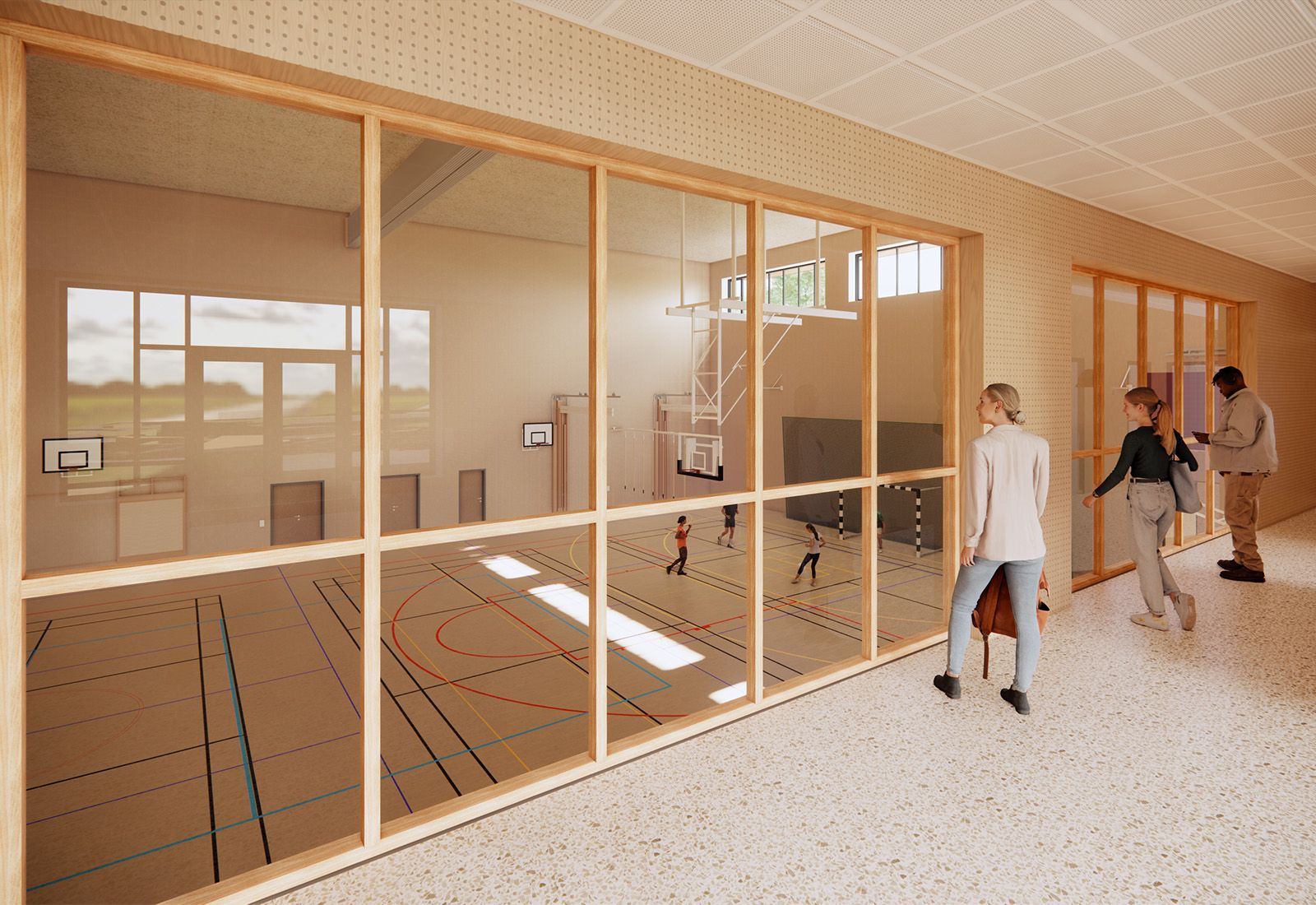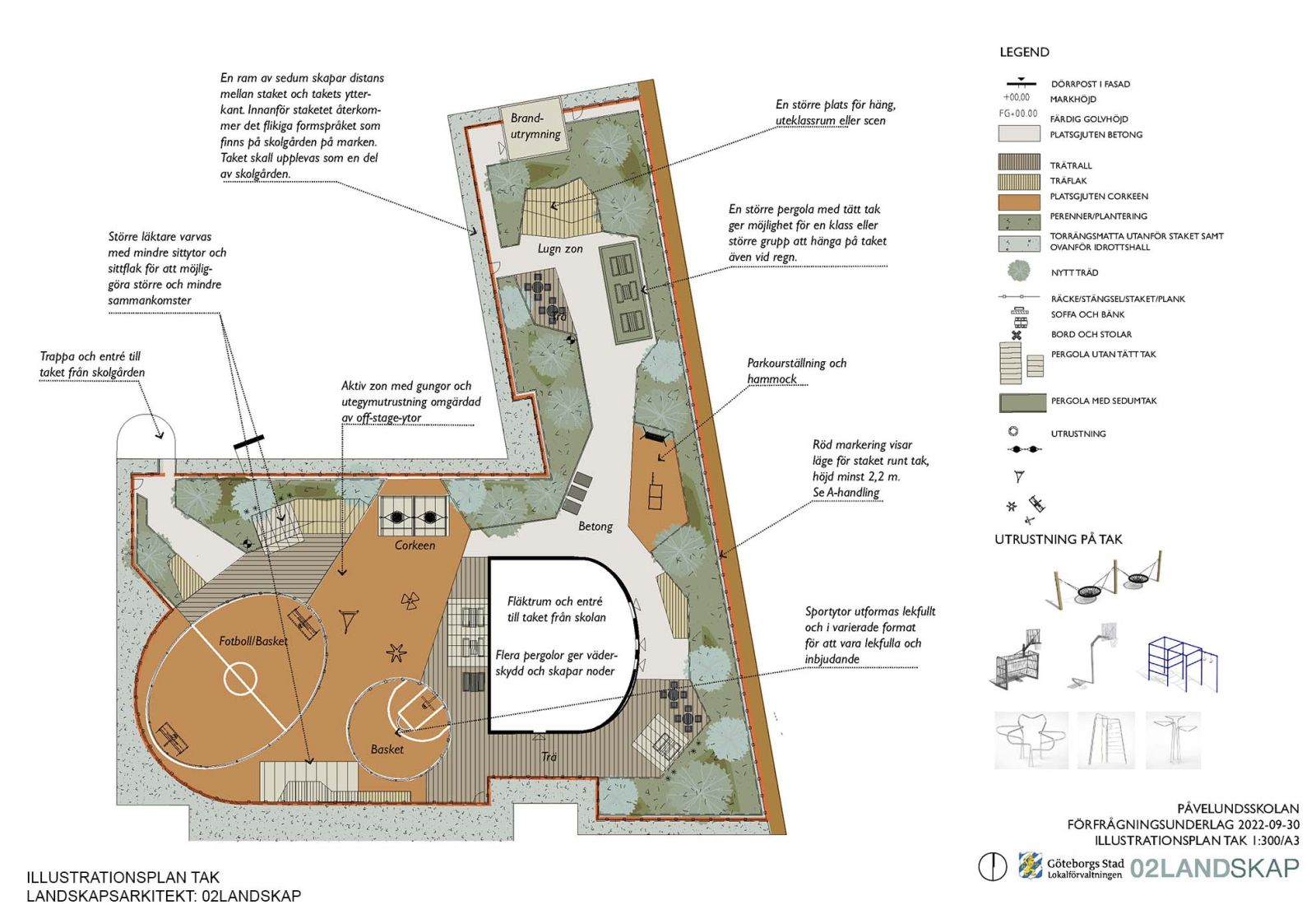 Den befintliga högstadieskolan kompletteras med en ny byggnadskropp, innehållande en ny idrottshall, undervisningslokaler samt en stor utvändig takgård för rast och rekreation utformad av 02Landskap.