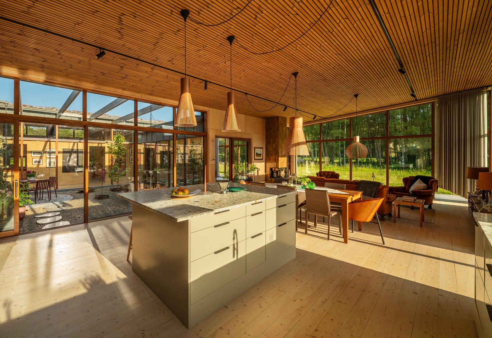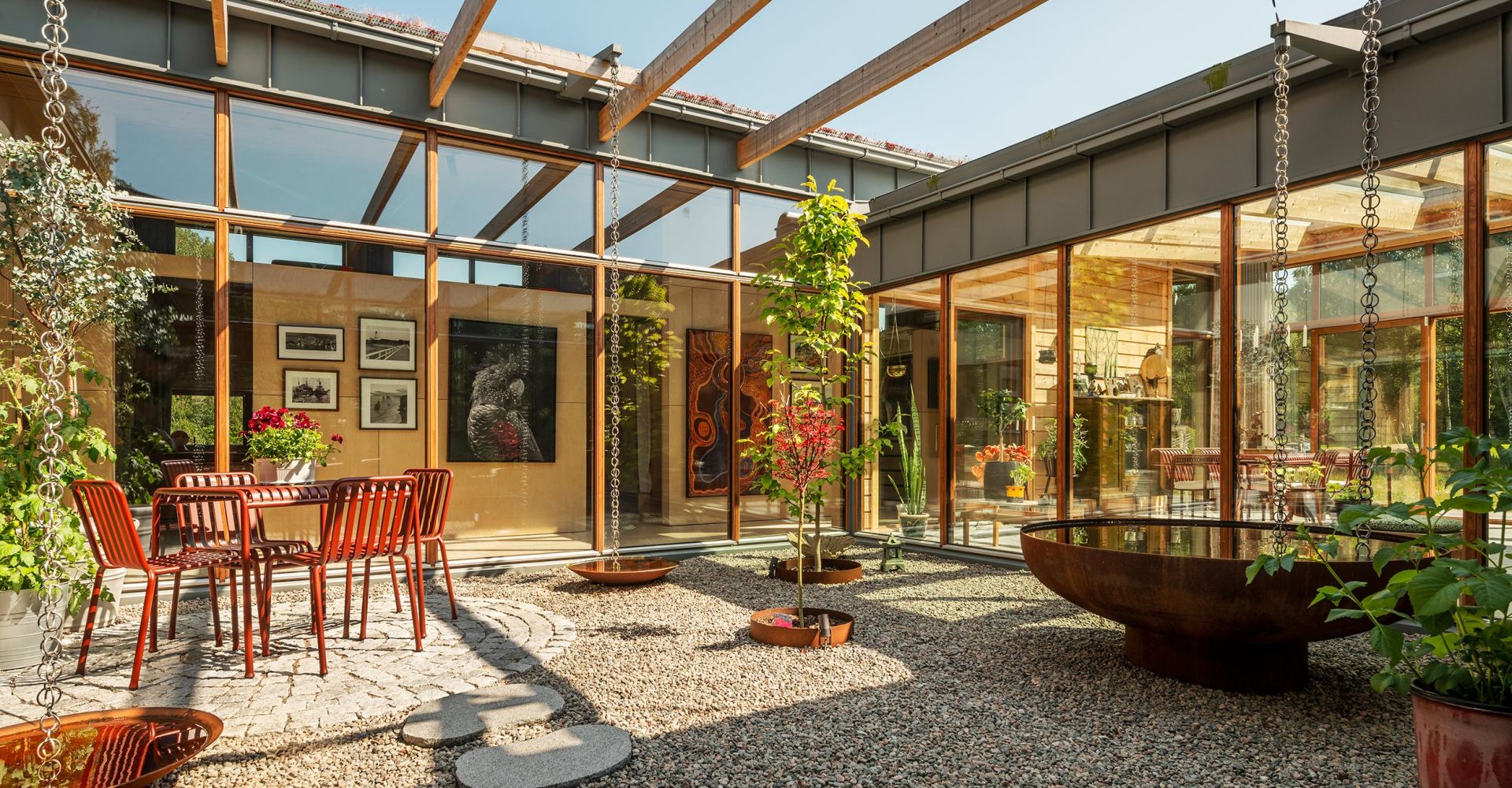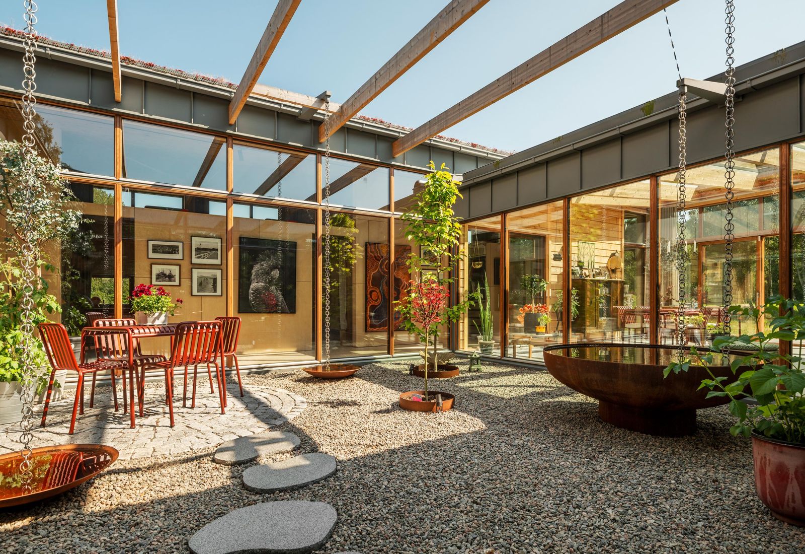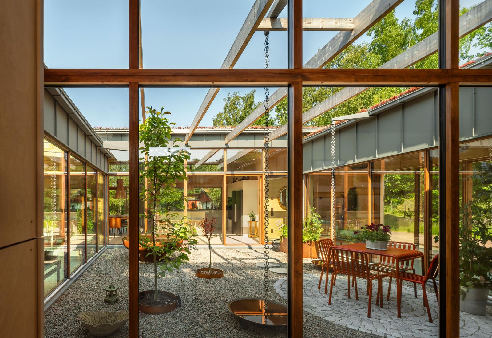 Det kringbyggda atriet inspireras av japanska trädgårdar med sin stenläggning, växtlighet samt de vattenspeglar som samlar regnvatten via regnkedjor från taket.