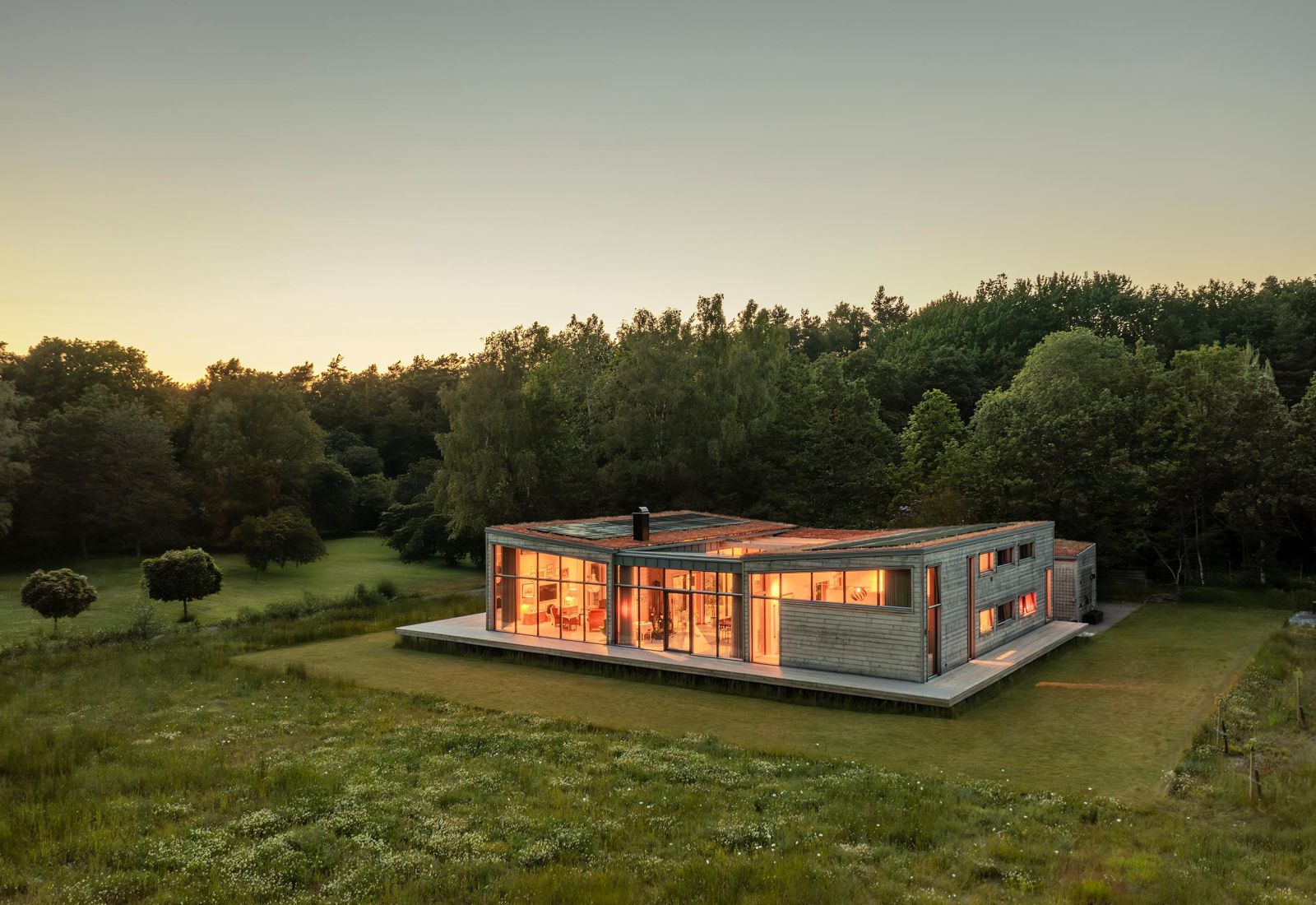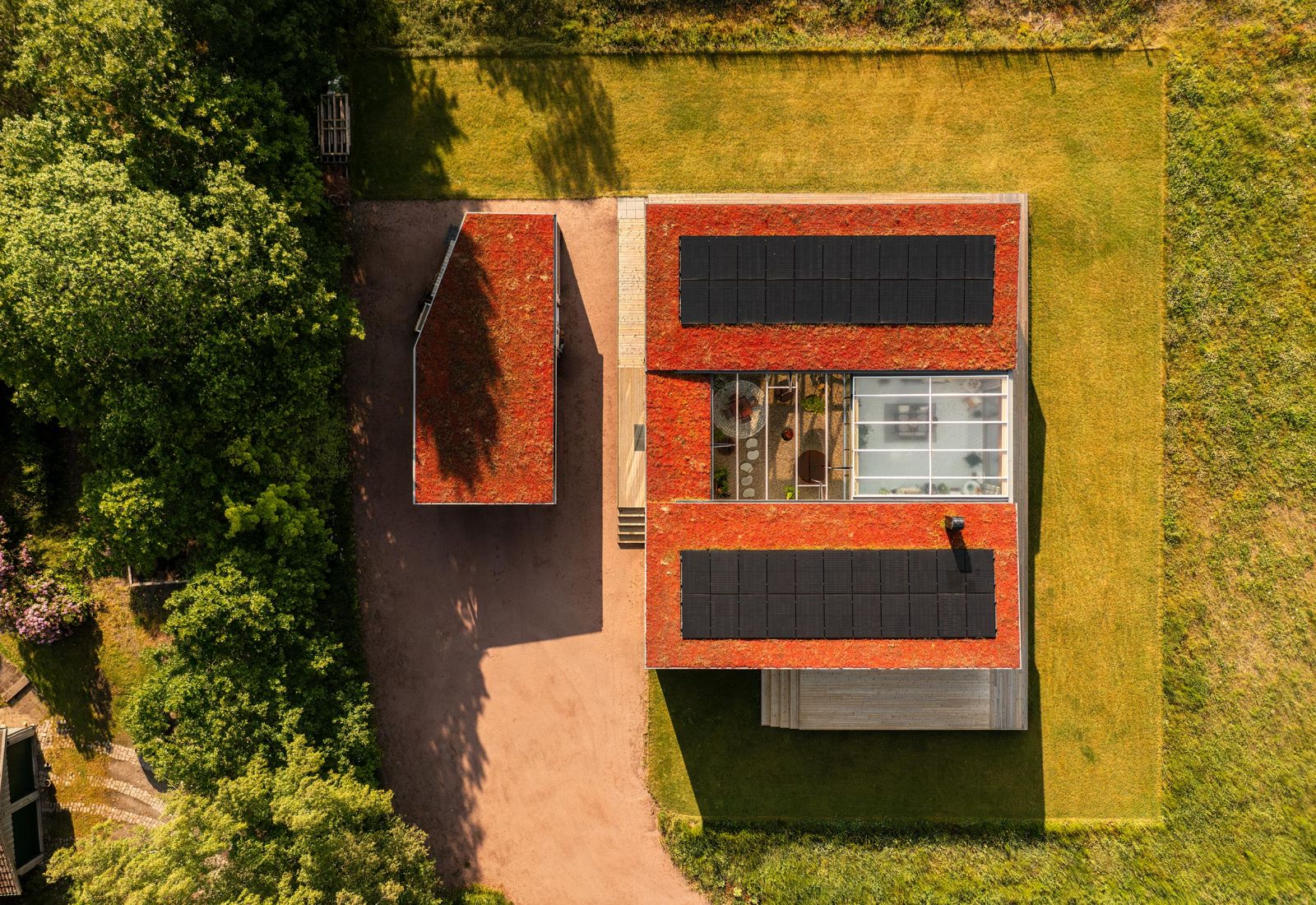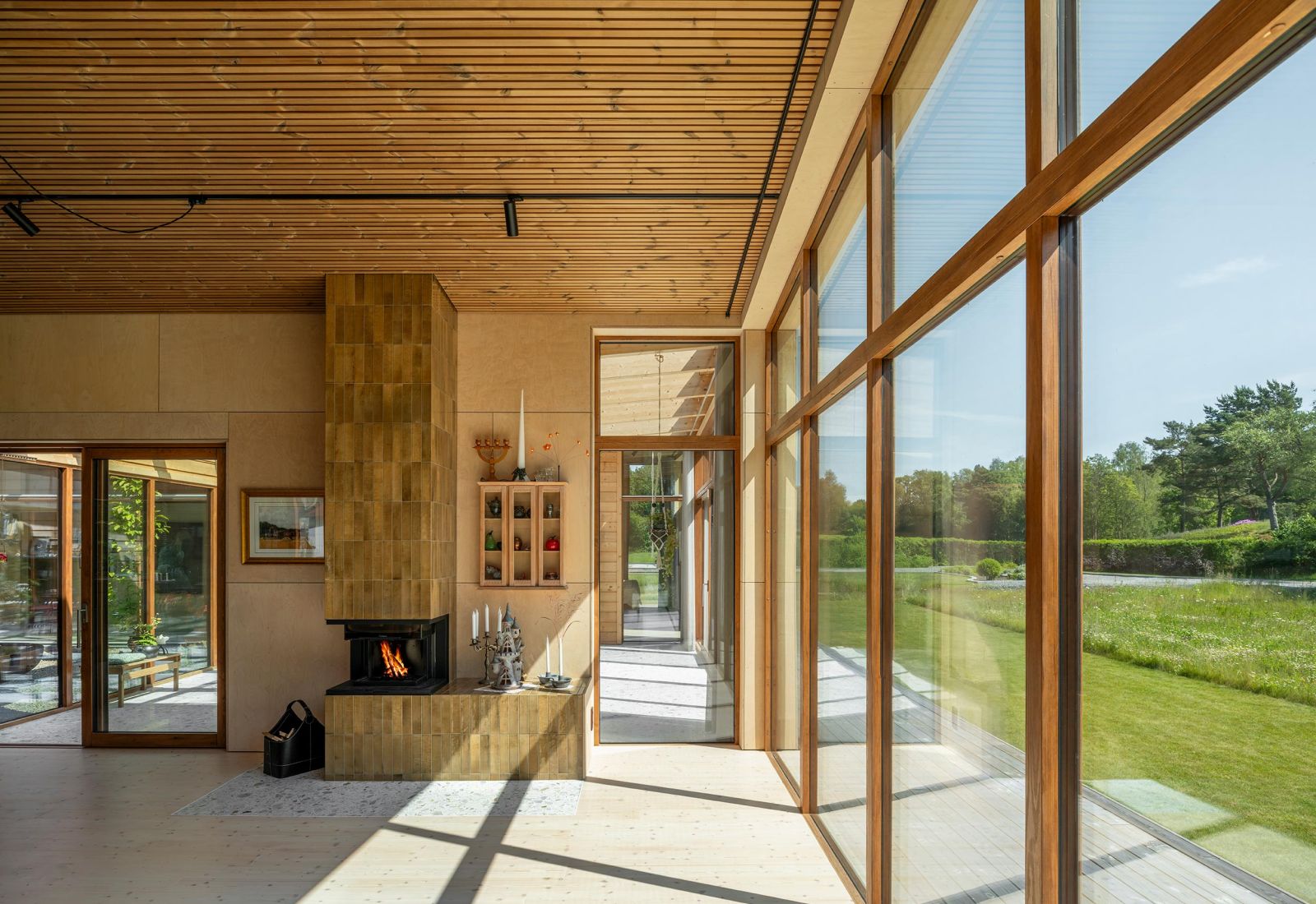 Byggnaden är helt konstruerad med limträpelare och limträbalkar. Utvändigt är villan klädd med obehandlad granpanel samt har ett tak av sedumväxter. Även interiören genomsyras av naturliga materialval med väggar klädda i panel av björkplywood, träribbtak i furu, trägolv i gran samt terrazzogolv i orangeri, hall, bastu och WC.