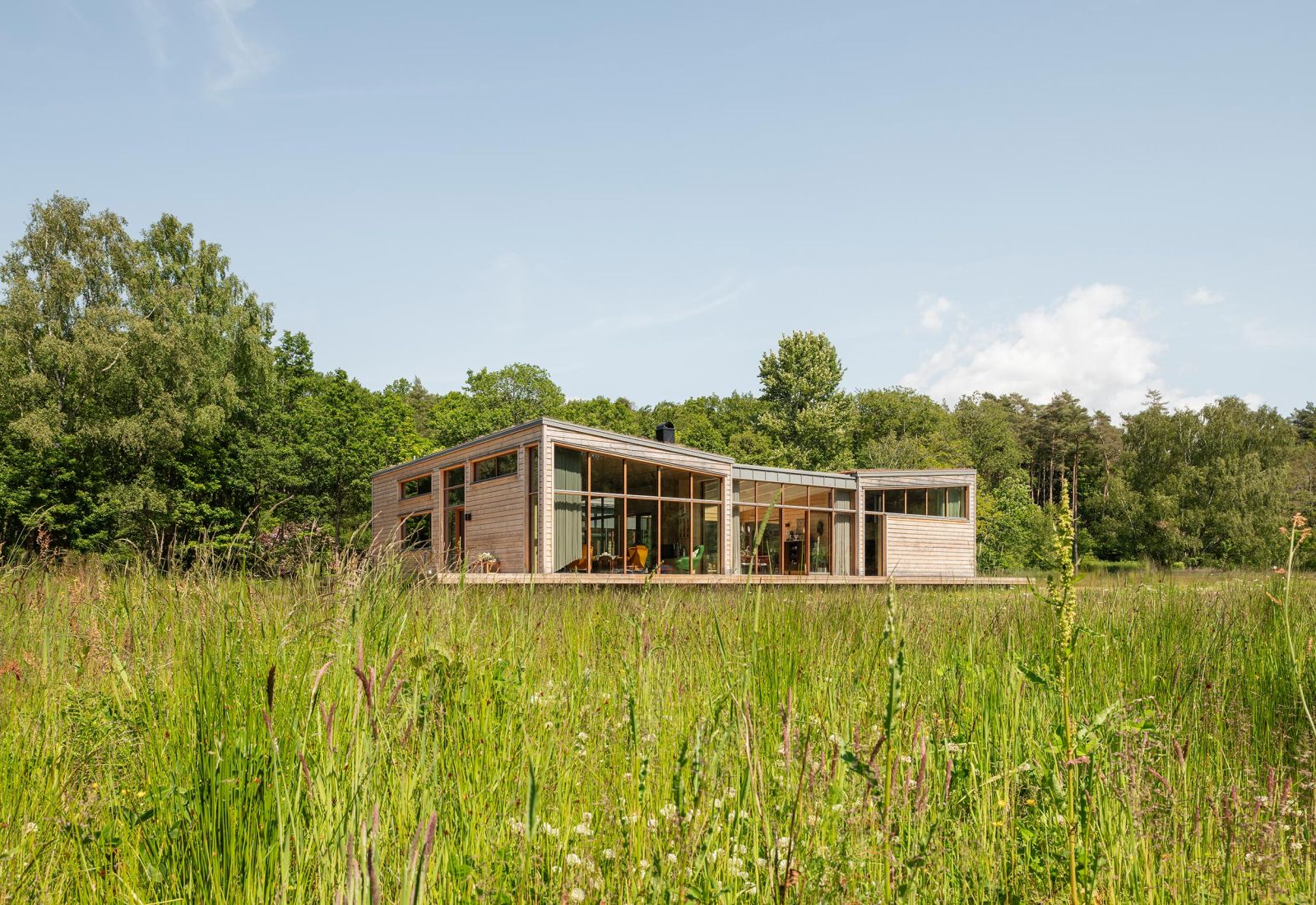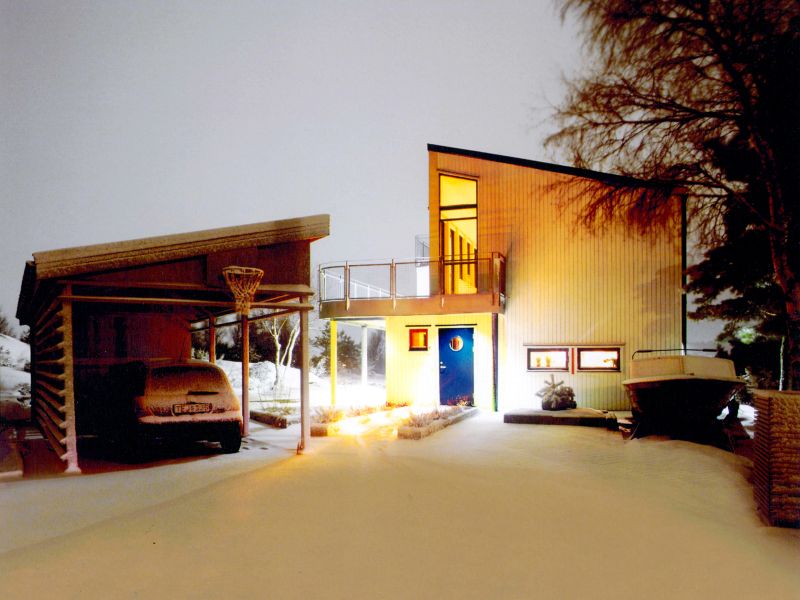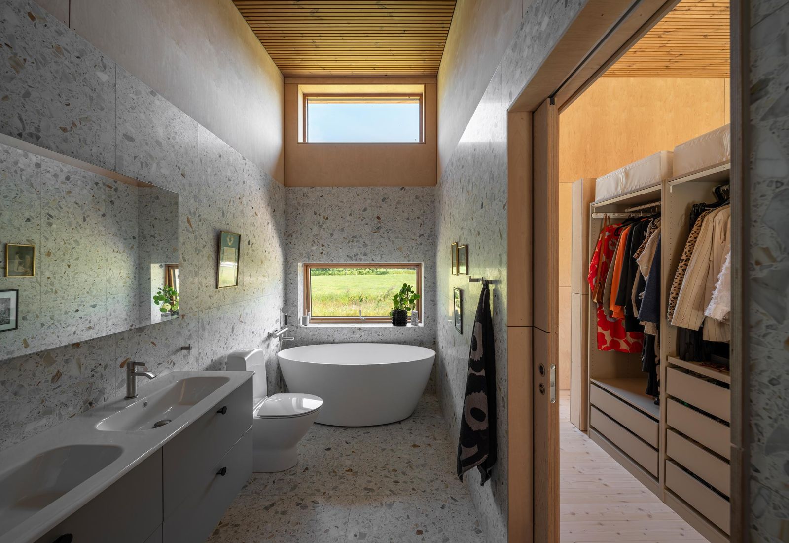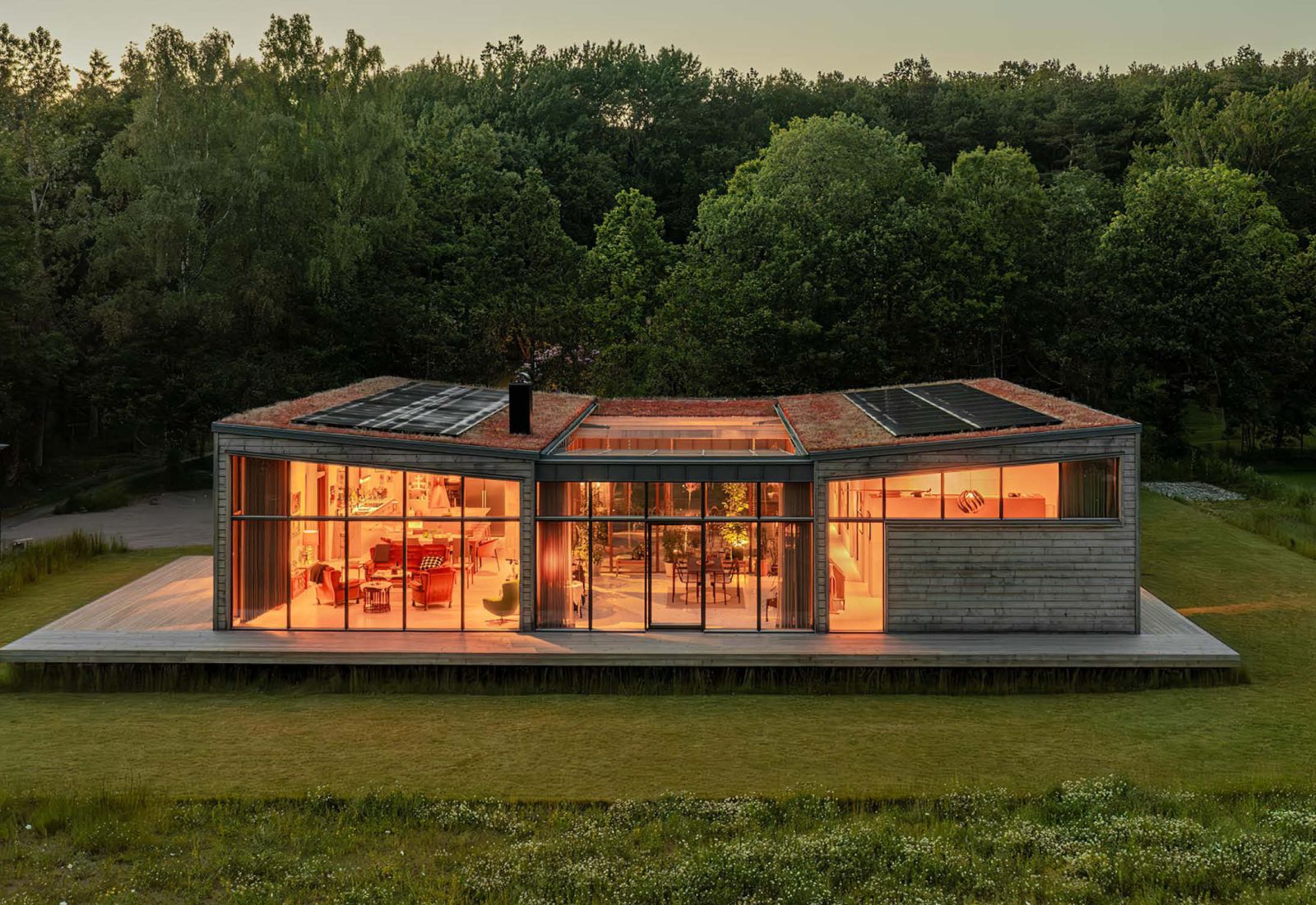 Byggnaden är helt konstruerad med limträpelare och limträbalkar. Utvändigt är villan klädd med obehandlad granpanel samt har ett tak av sedumväxter. Även interiören genomsyras av naturliga materialval med väggar klädda i panel av björkplywood, träribbtak i furu, trägolv i gran samt terrazzogolv i orangeri, hall, bastu och WC.